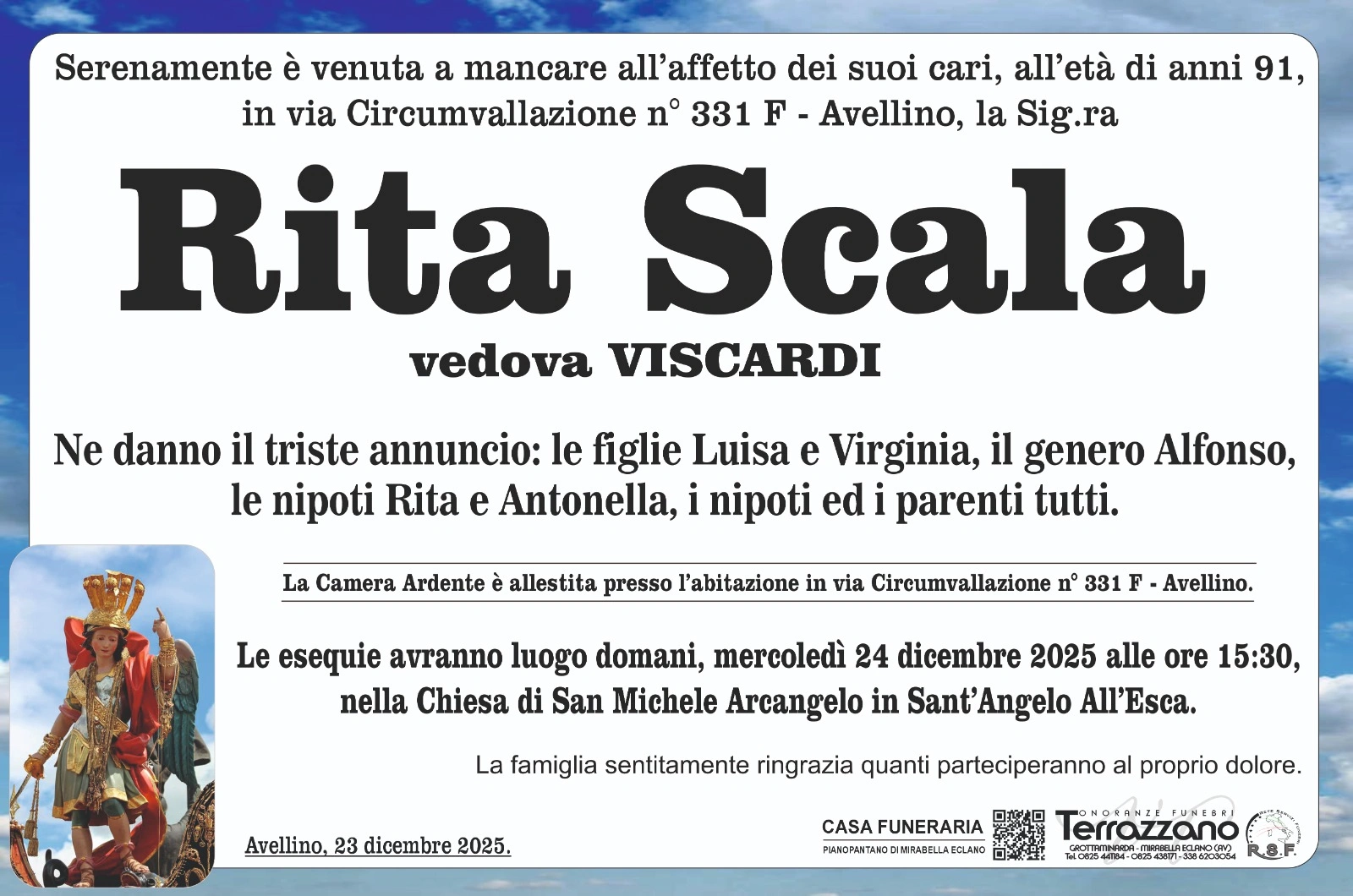 La Camera Ardente è allestita presso la propria abitazione in Via Circumvallazione n° 331 F – Avellino