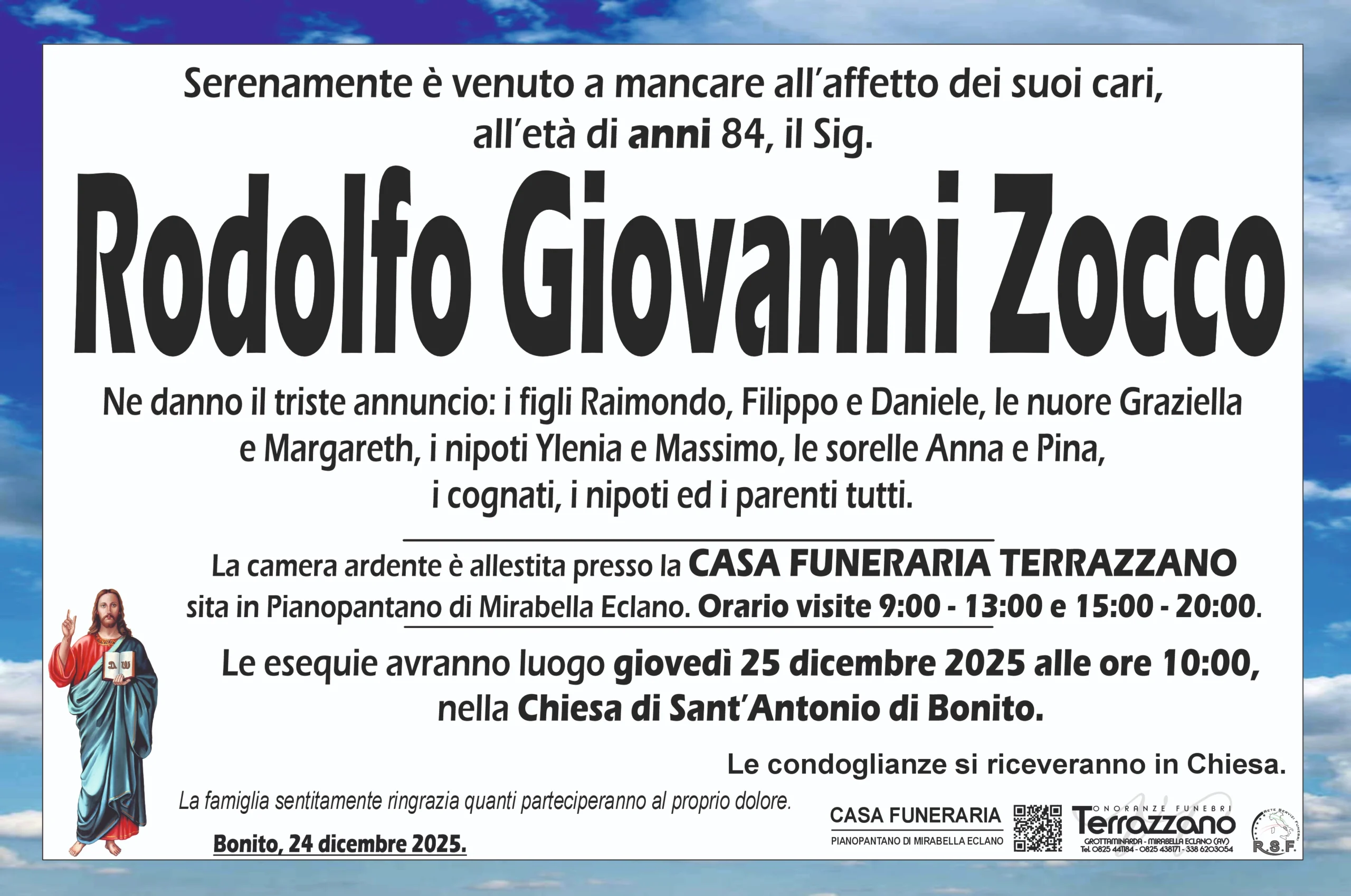 La Camera Ardente è allestita presso la CASA FUNERARIA TERRAZZANO. Orario Visite: 9:00 – 13:00 / 15:00 – 20:00.